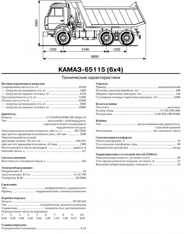 Знаменитый трудяга «танк» КАМАЗ 65115 не боящийся никакой грязи. КАМАЗ—65115-048-97 - универсальный самосвал, применяющийся во всех сферах деятельности человека, где требуется транспортировка сыпучих грузов, начиная от использования в сельском хозяйстве для перевозки грунтов, заканчивая использованием его в сфере строительства, для транспортировки песка и строительного мусора. Одной из характерных особенностей автомобиля КАМАЗ-65115-048-97 является отсутствие подогрева самосвальной платформы общим объемом 10,5 кубических метров, и отсутствие тягово-сцепное устройство. На КАМАЗ—65115 устанавливаются турбодвигатели отечественного или импортного производства (в зависимости от комплектации) от 260л.с до 300л.с. соответствующий стандарту ЕВРО III и КПП – 154 или ZF (в зависимости от комплектации). КАМАЗ—65115 комплектуется антиблокировочной системой (АБС/ABS) в приводе тормозов и отвечает всем нормам по безопасности на дорогах.